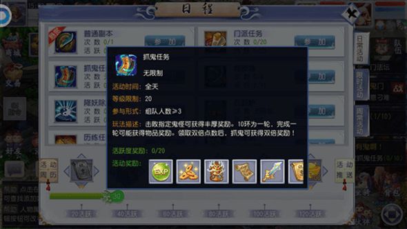 点击主页面日程,点击参加捉鬼任务,就可以进行捉鬼任务操作啦~~【活动时间】:全天【活动形式】:至少3人的组队任务【等级限制】:达到20级【活动描述】:击败指定鬼怪可获得丰厚奖励。10环为一轮,完成一轮可能获得物品奖励。领取双倍点数后,捉鬼可获得双倍奖励。【活动奖励】:经验值、铜币、古董、藏宝图、普通装备、帮派银票玩家参与任务后,可以前往长安钟馗处领取任务,帮助秦将军捉鬼此处任务需要由