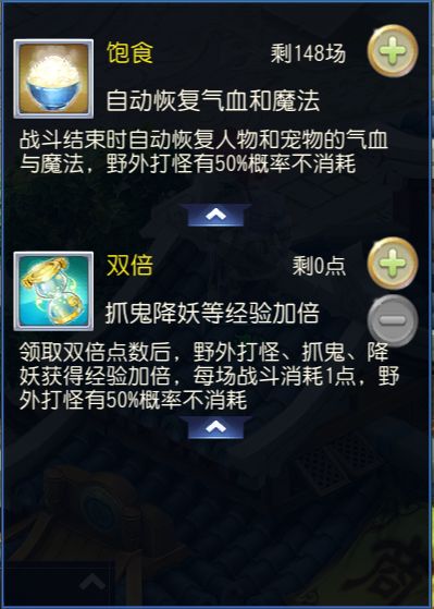 【饱食度】 用来每轮战斗结束后来补充人物和宠物消耗的气血和魔法挂机、打怪、活动、副本必备最高可补充至1000场剩余场数一定要记得查看哦
