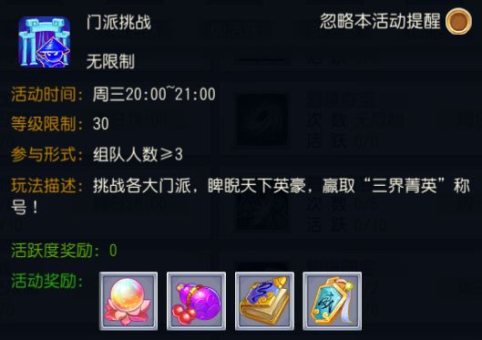 【门派挑战】活动时间:每周三、周六20:00-21:00参与条件:人物等级≥30级、组队人数≥3人闯关规则:1、若队伍内存在低于30级的玩家或队伍人数少于3人,则不能进入门派闯关活动2、点击便捷组队,则自动将玩家加入当前活动的门派闯关队列3、门派闯关任务共有6种,分别对应6个门派的首席4、闯关数排行前五的玩家可获得特殊称谓奖励活动奖励:高级宠物技能书、低级宠物技能书、修炼丹、洗宠丹称