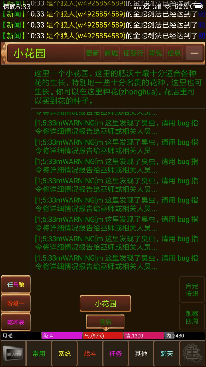 明教入门拜师就这个地方,这里再说一下,进房子或者山洞,左下角会多一个选项进去,或者直接输入代码:enter、out之类的,有些地方可能需要先look才会显示。7、一路拜师学艺学到张无忌这边,基本上能找师傅学的都差不多了,然后就需要自己解密去学乾坤大挪移跟九阳神功。乾坤大挪移 (qiankun-danuoyi) 要求:明教弟子,不能是太监,先天悟性 > 27,最大内力> 6000,有效内功 > 450 路径:同九阳神功,到明教密道,一直open north,找到阳顶天夫妇遗体,ketou, 就会掉出信和羊皮,信是阳顶天的遗信,羊皮当然就是乾坤大挪移心法了。 注: 可以读到380级,每50级一层,最高七层,每一层需要多1点先天悟性,所以修 满七层需要34点先天悟性。乾坤大挪移不能越过有效内功的三分之二,还受 parry限制,350级前还受最大内力限制,公式是 乾坤大挪移等级=(最大内力-4000)/20,这样你最大内力达到11000就可以不受 内力限制了。如果越过限制修炼会中乾坤毒,只有九阳神功可解。 九阳神功可解。 九阳神功 (jiuyang-shengong)要求:明教弟子,不能是太监,先天悟性30,先天根骨32,最大内力 > 3500,武学修养 > 100路径:于张无忌处,ask zhang 九阳秘籍,然后到明教的半山腰的密洞(这里开门需要内功要达到300,2000内力),进去后可以open 方向,来打开四面的门,往北走3步,往西走一步,再up,就可以找到成昆.杀之,取其头,然后出来从关外(rideto hujia;s;s;e)去冰火岛,上岛以后是个小迷宫,上下左右乱走也能进去,谢逊小石山的山洞里,见到后把成昆的人头给他,他会给你金毛(jin mao),然后再回张无忌处把金毛给他再ask zhang 九阳秘籍得到经在油中的提示。然后上昆仑啦(rideto kunlun;sw;se;eu;s;jump down)。这里最好用大米背你跳下去,让你的拿书id晕掉,然后另外拿个大米背着他jump down,醒了以后如果没有出路就zuan cave(如果发现有出路路,那就不是拿经的地点,就重新跳一次)进去里面找到一个受伤的猴子它会follow你,然后你带它去找到树枝,snap 树枝,用树枝给他包扎(指令bandage),然后它会给你一本经书,这个时候open bag就可以得到九阳真经啦。注: 可以读到380级,没有找张无忌问也可以拿到包,但是打不开。九阳神功受force,unarmed,sword或blade的限制