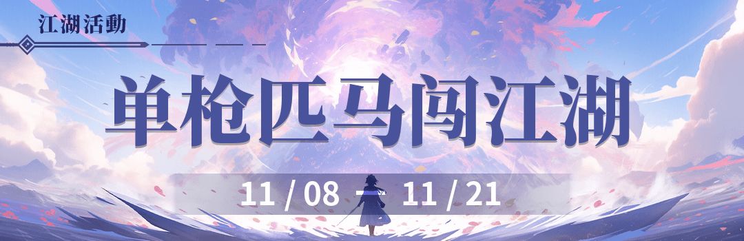 活动一、单枪匹马限定登陆豪礼 【活动时间】11月8日维护后~11月21日 【活动区服】铁血武林全服、武林英雄全服、文通武达全服、武极化宗全服、十六门派1-27服 【活动内容】活动时间内每日登陆游戏的玩家即可领取登陆好礼! 所有玩家每日登陆游戏可领取:千机券礼盒*1,华山论剑红包*1 活动二、单枪匹马限定打折集市 【活动时间】11月8日维护后~11月21日 【活动区服】铁血武林全服、武林英雄全服、文