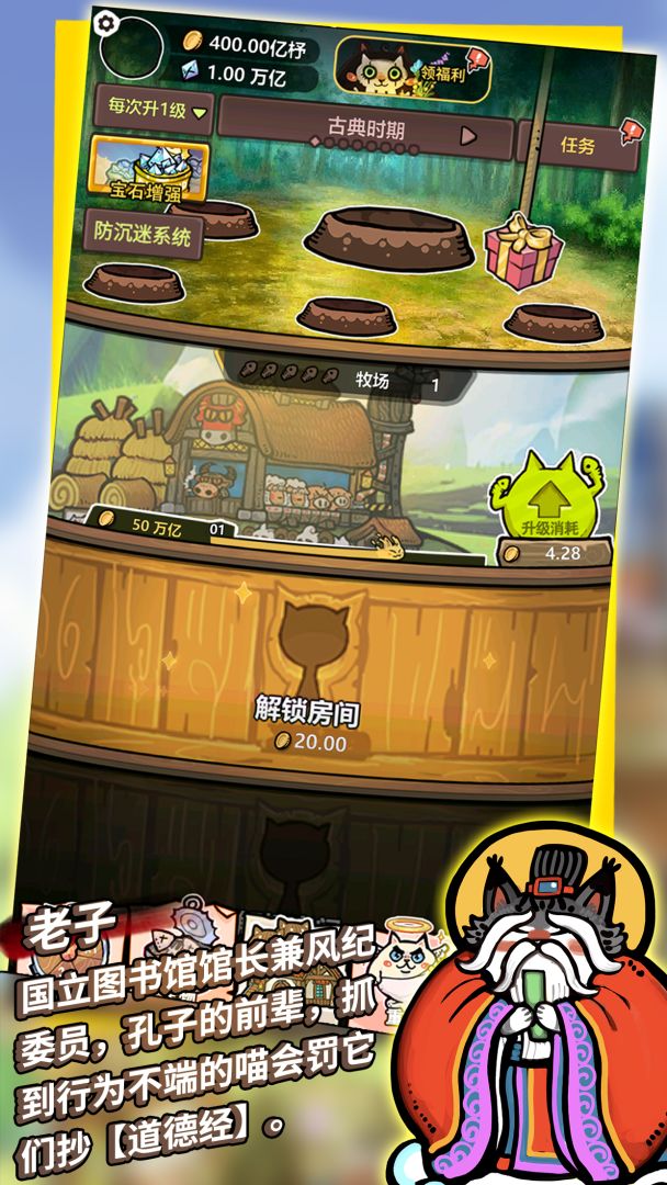 轻度的挂机玩法,让你只需在闲暇之余进入游戏,即可收集各个时空的名人猫咪们,并打造他们的家园。