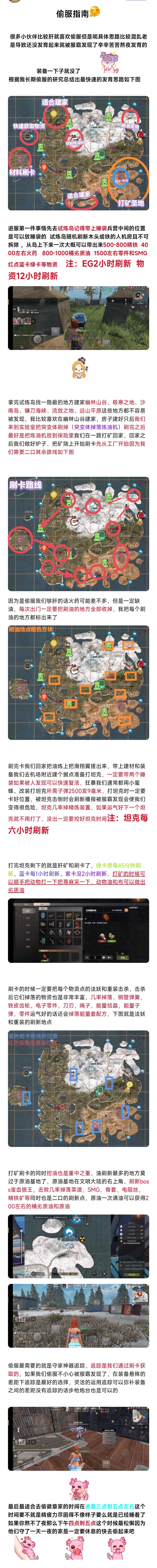 Hello 给各位萌新介绍如何从零开始发育的教程,一步步从零开始到最后霸服乱杀 作者:(启安) 1.独狼双排建家位置 独狼可以选择地图上[废弃工厂 废弃研究所 加油站 超市 仓库] 特点: 便于控绿卡房获得蓝卡。 除了仓库必刷绿卡 刷卡可以获得很多稀有物质。 2.三排四排建家位置 双人或多人可以选择[防空洞 实验室 港口 机场 核电站 匪徒营地] 以上都是大型物质获得点,也会掉落空投。 3.卡房位