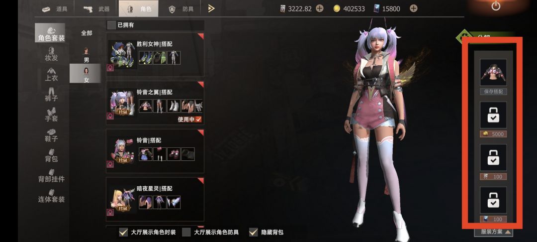 本次新更新增加的快速换装功能,首先要在仓库大厅内右边保存当前的搭配,初始只有一格,下面三个分别需要金币,贸易,点券大家量力而行,我觉得最好的搭配就是一套自己喜欢的,第二套最为推荐“老六套装”在趴下不动时极难被发现,可以打敌人一个出其不意,第三套有“能力”的可以搭配一套飞行角色在前期开荒时作用极大,使用方法也很简单,以后在家或者出门带个储物室,点开储物箱下面就会显示已经保存的搭配,点击即可快速换上,