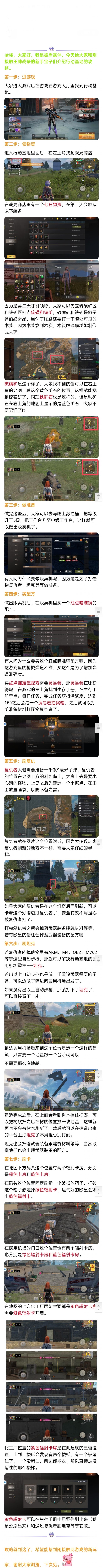 Hello 给各位萌新介绍如何从零开始发育的教程,一步步从零开始到最后霸服乱杀 作者:(启安) 1.独狼双排建家位置 独狼可以选择地图上[废弃工厂 废弃研究所 加油站 超市 仓库] 特点: 便于控绿卡房获得蓝卡。 除了仓库必刷绿卡 刷卡可以获得很多稀有物质。 2.三排四排建家位置 双人或多人可以选择[防空洞 实验室 港口 机场 核电站 匪徒营地] 以上都是大型物质获得点,也会掉落空投。 3.卡房位