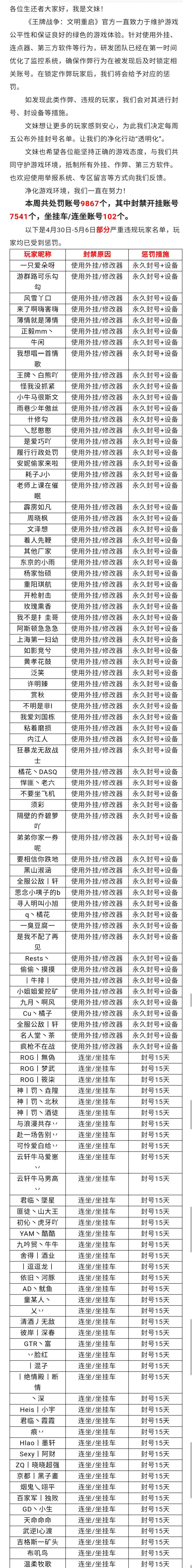 4月30日-5月6日净化游戏环境声明及处罚公告