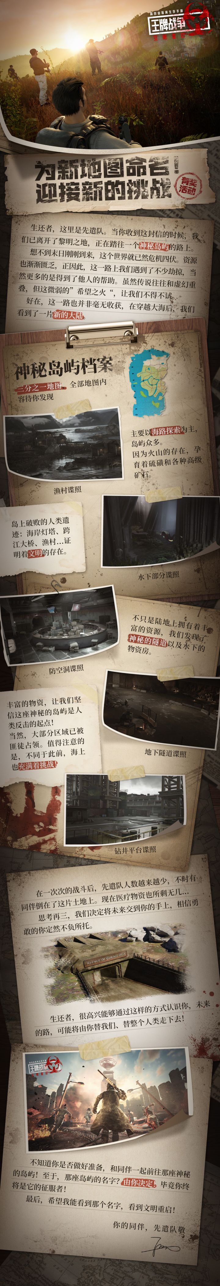 【体验服招募】新的大陆!新的征途!各位小伙伴们大家好,《王牌战争:文明重启体验服》近期将开启大版本【遇见曙光】的新版本测试,本次测试将推出全新地图“曙光群岛”除此之外,全新水上载具等新内容也等待你亲自发现!现在前往快爆填写专属招募问卷,即有机会参与本次测试!想要体验新玩法新模式的小伙伴就赶紧看过来吧!开始之前,我们先做个自我介绍!《王牌战争:文明重启》是一款超自由度末日生存手游,沉浸式还