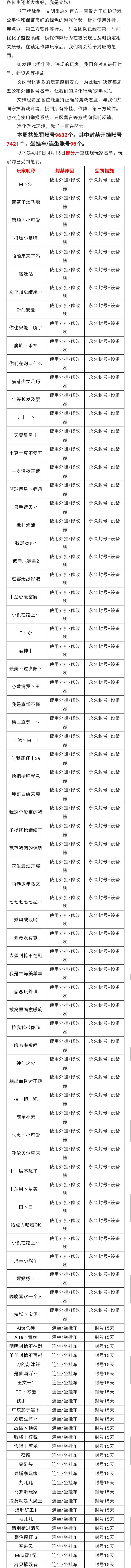 4月2日-4月8日净化游戏环境声明及处罚公告