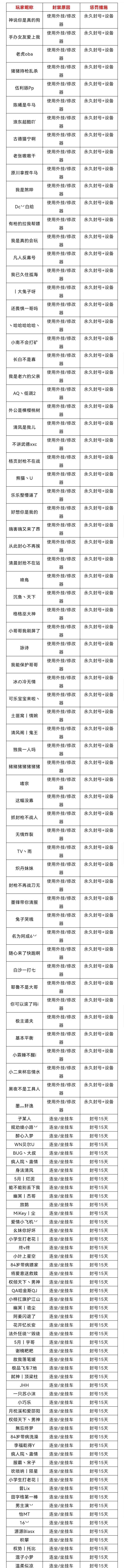 《王牌战争:文明重启》官方一直致力于维护游戏公平性和保证良好的绿色的游戏体验。针对使用外挂、连点器、第三方软件等行为,研发团队已经在第一时间优化了监控系统,确保作弊行为在被发现后及时锁定相关账号。在锁定作弊玩家后,我们将会给予对应的惩罚。如发现此类作弊、违规的玩家,我们会对其进行封号、封设备等措施。文妹想让更多的玩家感到安心,为此我们决定每周五公布外挂封号名单。让我们