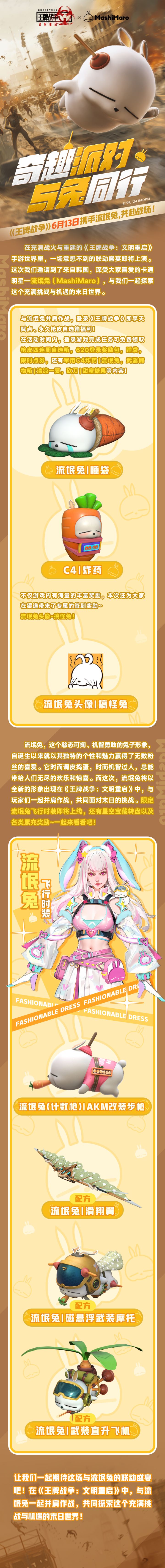 在充满战火与重建的《王牌战争:文明重启》手游世界里,一场意想不到的联动盛宴即将上演。这次,我们邀请到了来自韩国,深受大家喜爱的卡通明星——流氓兔(MashiMaro),与我们一起探索这个充满挑战与机遇的末日世界。