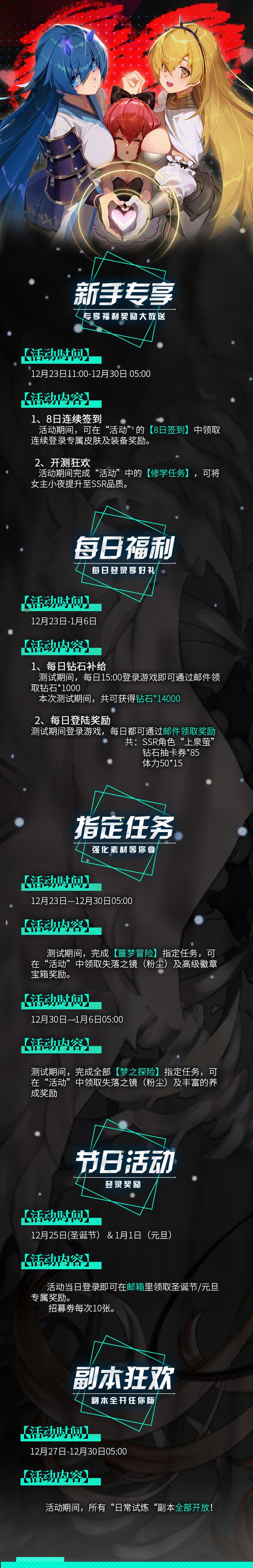 亲爱的观众朋友们下午好~这里是你们勤劳又可爱的主持人阿茴~φ(>ω<*)本次重塑测试已经于12月23日开启啦,阿茴看到有很多小可爱在关心本次内测的活动及福利呢~阿茴现在整理出一份每日活动的攻略,各位链接者大人可点开长图查看详情哦~