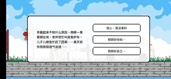 体验完这一整套下来,年龄渐长的我,成功的投入进来。可能是因为我代入的太慢了也可能是因为剧情虽然清晰但不够细节吧,直到最后儿子推着我走出医院我才如梦初醒般感觉到……原来,我。。快要 不行了吗……明明我还在救护车前自大的说自己没事,明明还盼望着能看着能抱起大胖孙子的情节,明明……这才刚开始啊。我茫然的任由儿子的推着。路上,蓝天白云,道路上点点花朵,我只是无奈说:不能再陪你了。突然,只剩下我一个人推着轮椅,我福如心至,大概过了那片桦树林,就会有一个墓碑了……雪渐随场景融化,树木郁郁葱葱,我心情低落的谷底。我像是不甘的,拼命按着后推键,我成功了……。回到医院,儿子出现了,我引着他,看了我在救护车,在他拎女朋友来家里,只是……回到他第一次离家远去时,他不见了,我那种逆转时间仿佛如同玩笑,毕竟我早有归宿了,我焕发的黑发,随着我想着终点前行再次花白,儿子再次推着车,我也淡然的走到墓碑里,毕竟这一路上挺好的。