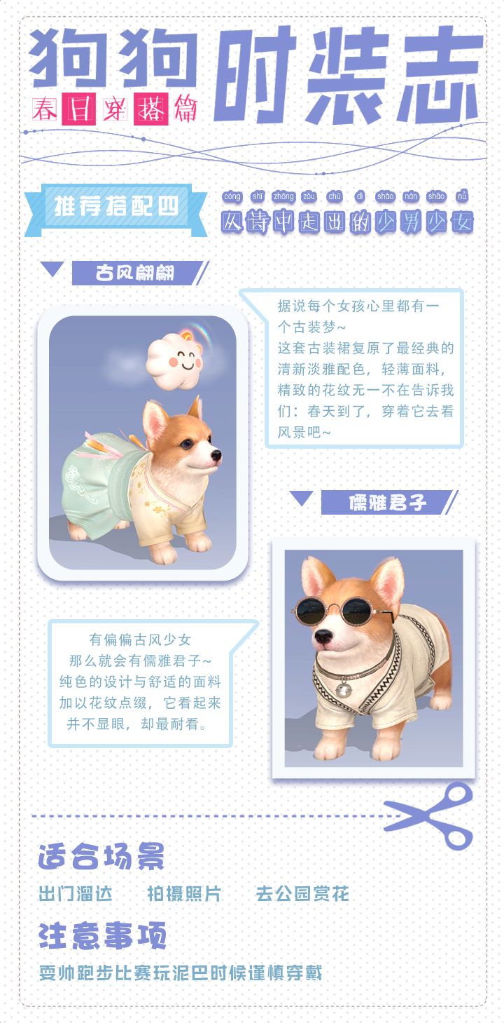 上一期,可爱的柯基迪迪为我们带来了精彩的时装show,这次,我们的怪才家长们,又给它准备了什么样的可爱装扮呢?酷爱来康康吧!▅关键词-优雅-古典-轻盈▅关键词-可爱-萌到尖叫-cos今日份的小可爱就炫(对我说的是炫)到这里啦~下一次你希望是哪个狗宝宝在时装志中出场呢?顺便~各位家长还记得游戏中自家娃的名字么,如果你在愿意在评论中说出你家狗狗的——体型——性别——年龄——品种——名字!下