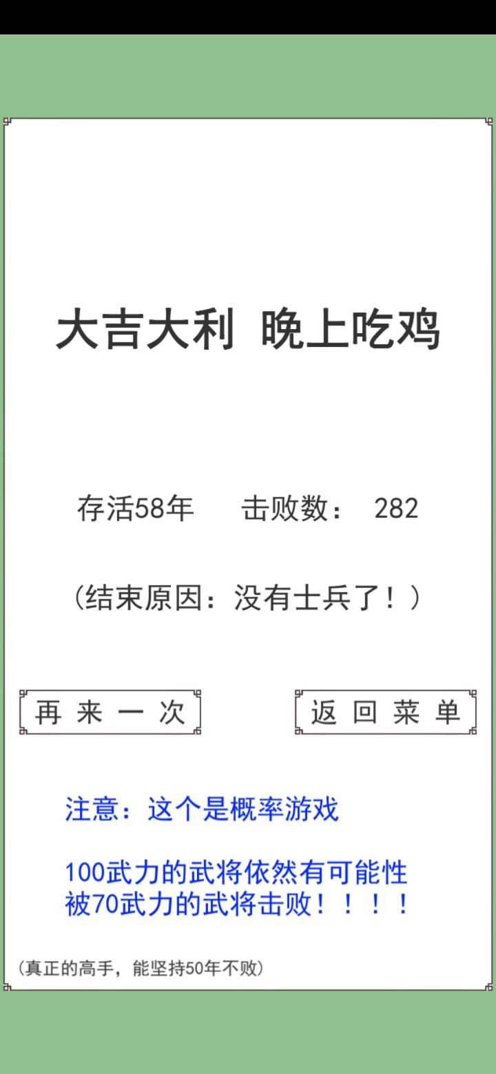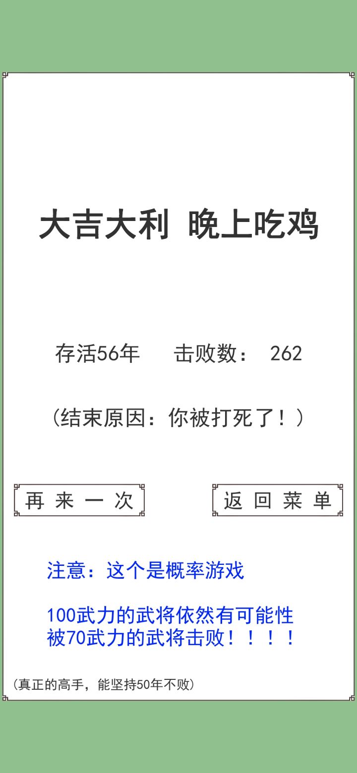 果然是个概率游戏,第一次玩就能苟56年(地铁),还有156被138打死概率也太小了吧,156死后其它小兵小将直接被连穿……