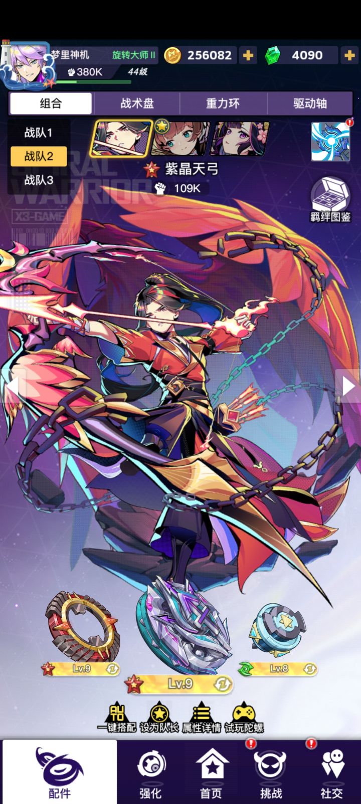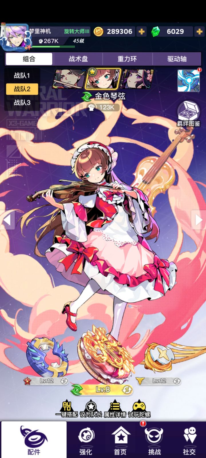 先说原理,天弓和琴弦都是c位,而且琴弦的输出是基于天弓带的驱动轴的智,但是琴弦的伤害量大于天弓。琴弦每次放大会创造六个创造物,每个琴弦大招的创造物会提升琴弦特性25%的治疗量(可叠加四十层,感谢“孤狐”大佬测试),琴弦的特性是对全队造成攻击力加成的治疗(可以吃的加成有攻击力和冲撞cd)。 原理讲完了讲一下搭配和芯片选择 一、紫晶天弓+王冠+智 芯片选择:重力环四绿加八技伤(感谢“玩游戏就要苟
