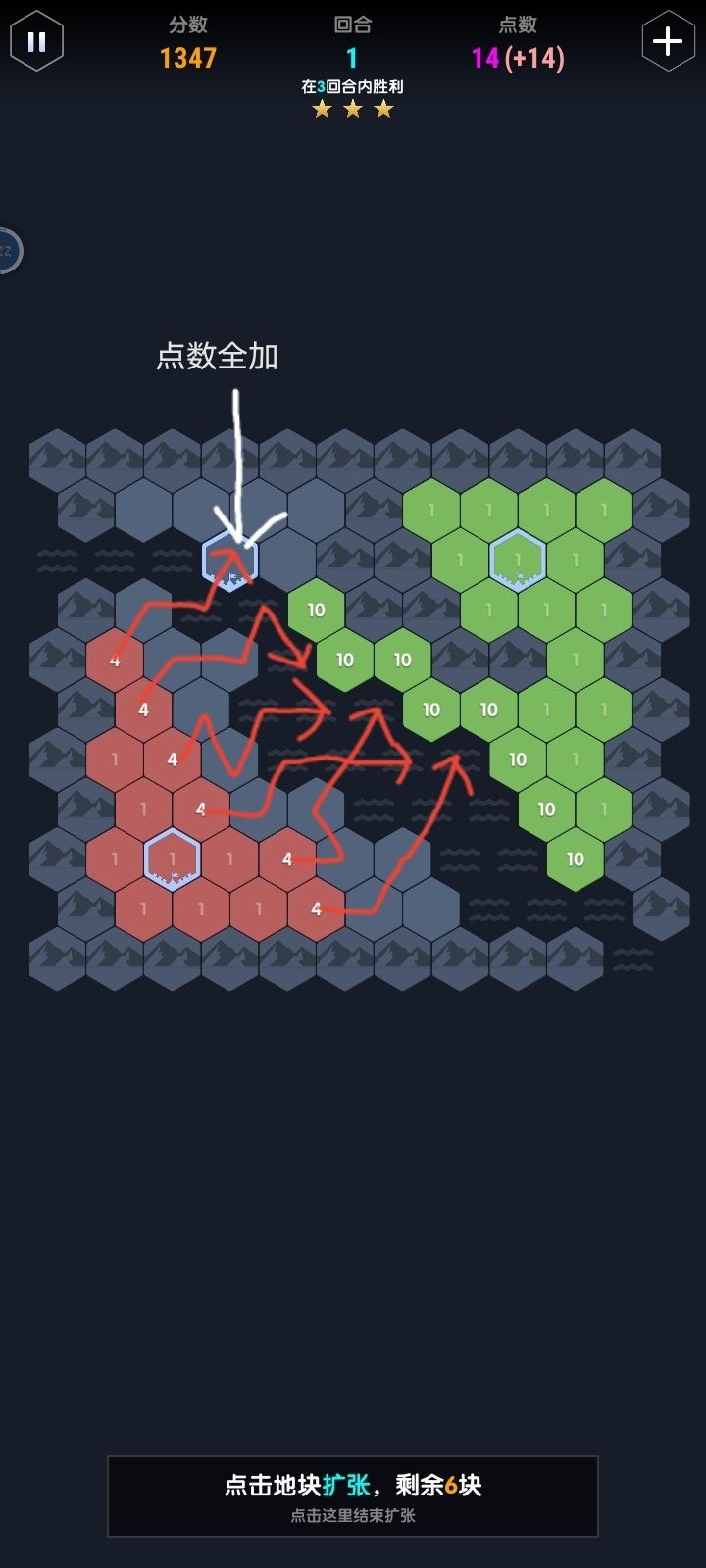 思路: 第一回合 占领二矿 并且布置好第二回合进攻10敌人位置(到敌人老家的最短路径上的10血敌人) 最后加点全加第二个老家 第二回合 海上利用1血我军进行第一次攻击 用二矿平推到敌人老家拦截(路径最短) 加点随意甚至跳过就行