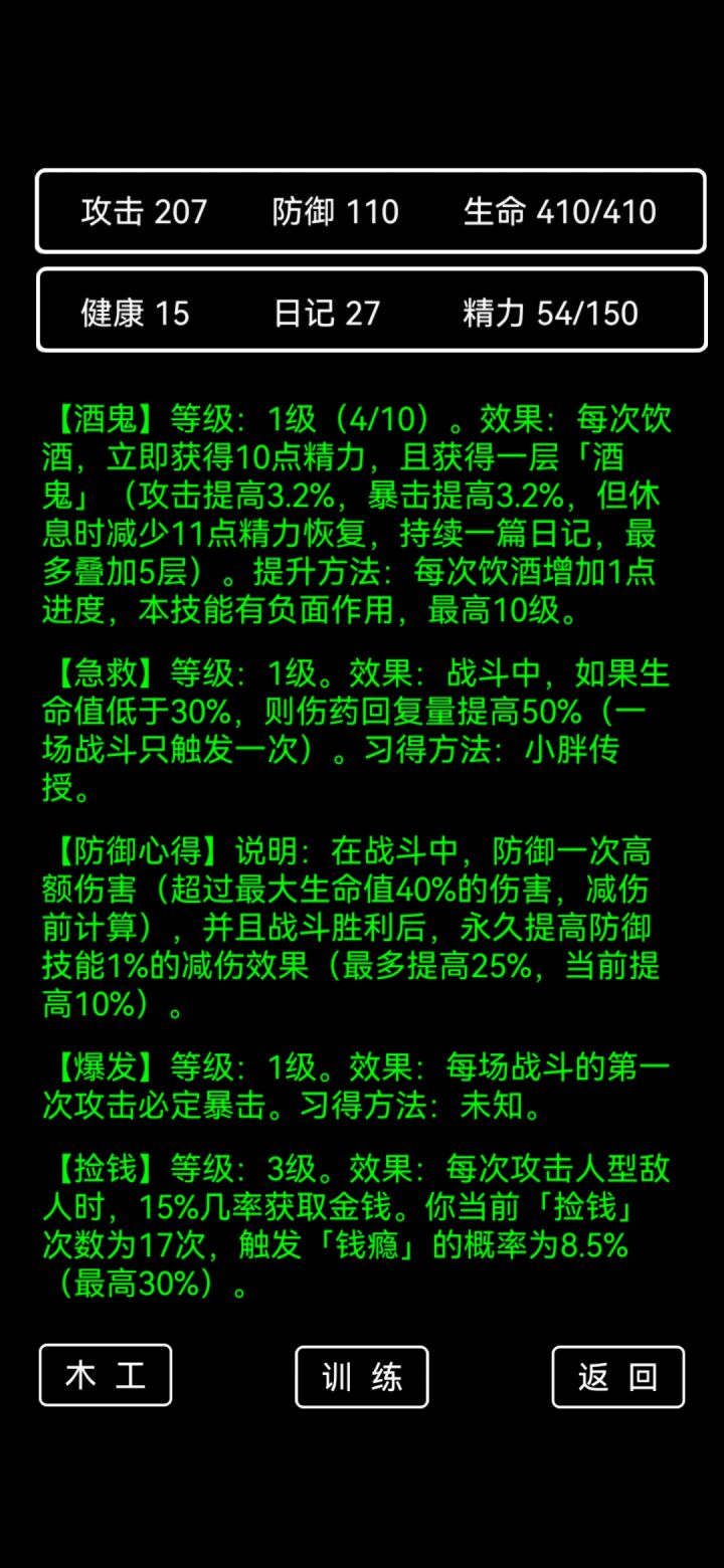 流浪日记2随手记《我一定要打爆刀疤男还有南城四蠢!》《剧情杀,不存在的,只要有血条,哪怕是神也杀给你看》日记剧情第三天晓月系统开启,建议点六次祈祷刷到一级,第一波盐老鼠来袭,第四天山谷大蛇出现,大蛇掉落精力上限+10食物6粘液3神秘晶石1,第六天木匠系统开启,(建议配合木匠bug至少刷满包,肝帝可刷全极品)备战纹身男,(要求三级攻四级血两三级皮五个药)能不能打过还得看脸,如果一直被打出流血那就凉