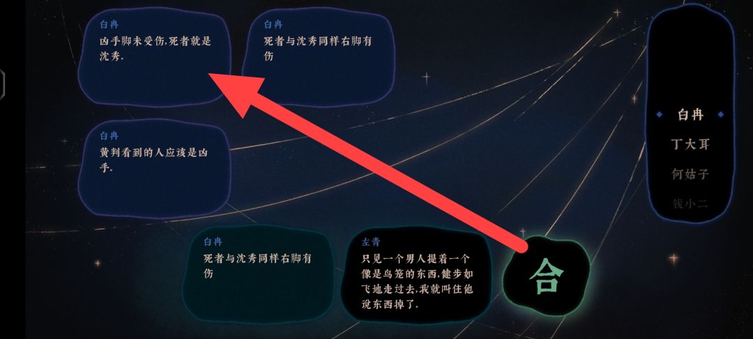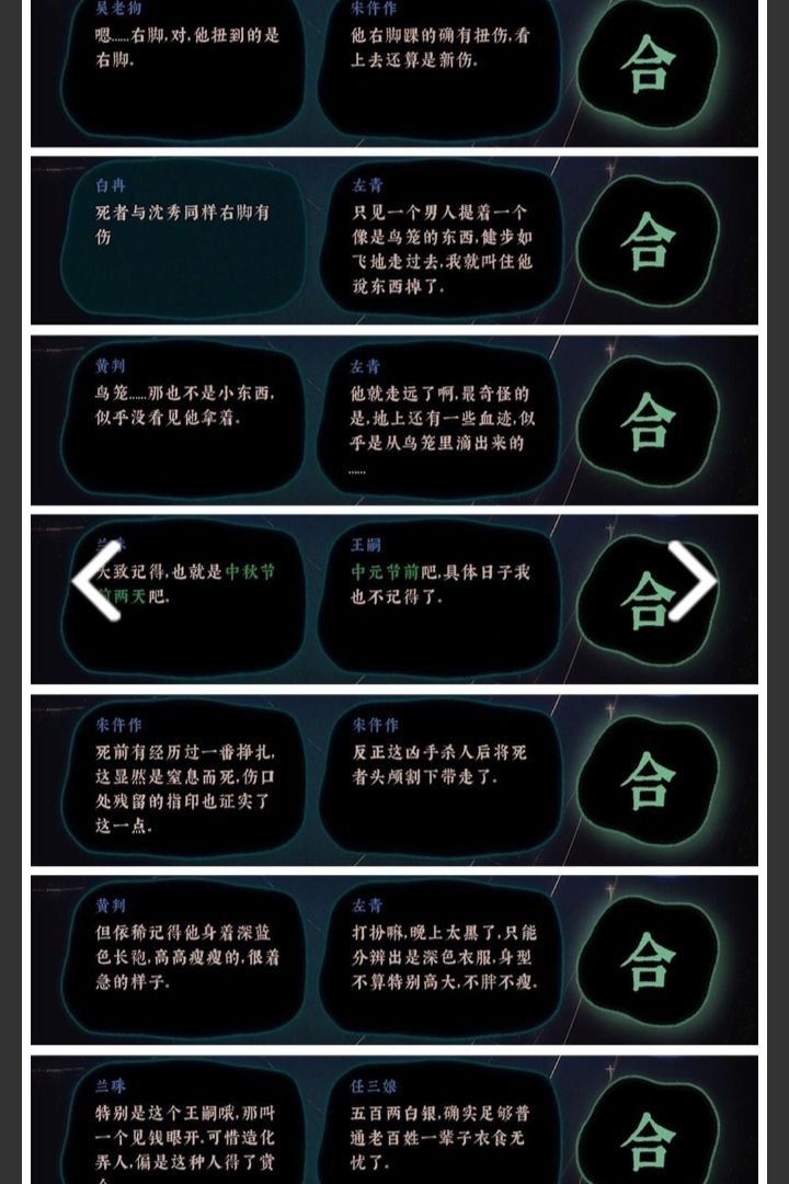 关于五日之期✓如何给鲶鱼青天大府尹作证痴情老哥无罪的短篇攻略(图看个方便 只有证据合成方法和提交顺序 别的妹有) 首先把骨里香的傲娇要你寡和渔伯感叹年轻小伙组合得到戍时离开 接着把戍时离开和骨里香吐槽臭气哄哄组合 得到痴情老哥早出早归 最后把早出早归和初心宋仵作的爱鸟哥亥时死亡组合得到不在场证明 okkkkkkkkk证据收集结束 接下来就到了最爽的直接乱糊系列了 不在场证明→戍时上船→早出早归 收工(PS:花里胡哨的是因为自己终于通了开心所以带有整活成分 图一乐呵 莫较真 顺便附上痴情男出狱后穿越美女依旧清醒的爽图 看的太爽了 希望骨里香小姐姐快跑 她值得更好的 远离这男的 不要靠近 会变得不幸( ・᷄ὢ・᷅))