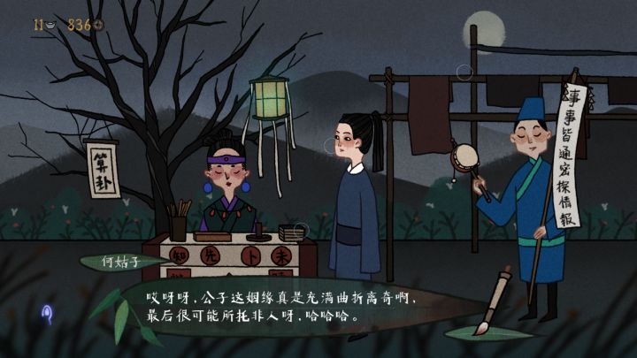 然后要去鬼市的话建议去买那个红色对话地摊上的真心水(后面左青的小情人是个可爱的小傲娇会用到)【注:千万别选那个女大当嫁,,不然会死的很惨,如果你没有我这么突如其来的幸运(前一秒刚存档,后一秒就选错了,中间有很多都没有存档的我表示很庆幸呜呜呜)的话千万别选!】然后你买了任何一个东西他都会送你一个定神丹(好像,反正备注是不能给人用。)