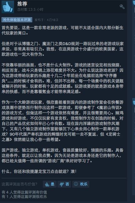 做为极少数来自中国的DRPG类游戏开发者,我们在steam上的传统欧美玩家群中也逐渐收获肯定。对于还处在EA阶段的《龙骑士之墓》来说是很大的鼓励。截至steam上架以来,已经有超过200多个批次的更新上传,同时也感谢来自国内国外玩家的反馈,让我们的游戏可以不断完善。截取了部分海外玩家的评价:……