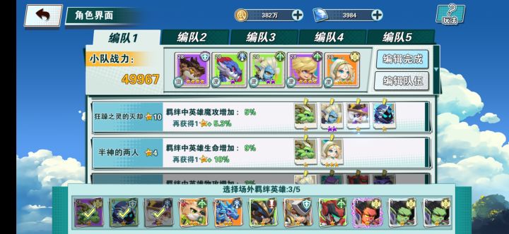 区服S20 名字 :嘟嘟 ID:46368大家看一下我的阵容,1.练度大于品质(重点,圈起来)2.把任何卡都留一个吧(这个随便吧,开羁绊有用)3.羁绊要注意呀!由于我一开始,没有注意羁绊,吃了很多卡,所以羁绊卡了一下,今天抽卡才把羁绊提一下。注意我的第一张图,英雄界面有两个面板,一个是编辑英雄,编辑羁绊。羁绊的强度跟星星有关。(所以记住了,卡可以吃,但是你得先看看自己需要什么羁绊,才