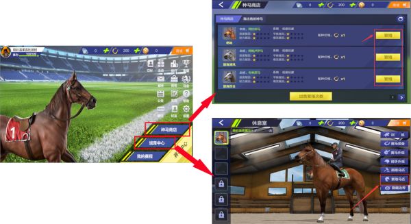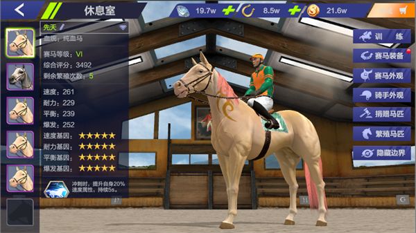 游戏内赛马属性包含:速度、耐力、爆发、平衡四条属性; 各属性的影响效果为: 速度:影响赛马的直线速度和初始速度 爆发:影响赛马爆发消耗耐力和爆发系数 耐力:影响赛马耐力最大值和耐力恢复速度 平衡:影响赛马弯道速度和弯道的加速度 那赛马的以上属性,该如何提升呢!请查看往下看: 途径1:马匹训练 途径2:马匹繁殖 接下来就是重点,了解全面将有助你,选择合适的赛马,更好的取得比赛胜利! 爆发能力强的赛马