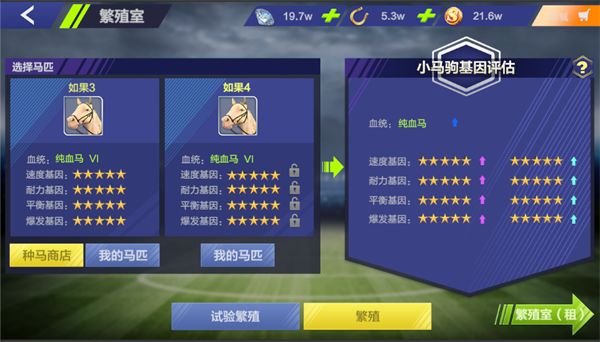 《飞马流星》独创的繁殖系统,让您亲自体验赛马繁殖的乐趣; 小编今天要着重介绍一下《飞马流星》的繁殖系统; 繁殖具体是怎么回事呢,通俗的讲就是使用两匹赛马使用科技的手段培育出一个小马胚胎; 每匹赛马都有繁殖次数的限制,每次繁殖会消耗两匹赛马各一次繁殖次数,次数用完之后就不能进行繁殖操作了; 繁殖的目的主要就是为了提高赛马的基因星级,拥有更高星级基因的赛马将可通过训练获得更高属性; 首先,我们从大厅的
