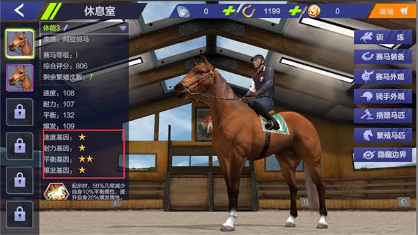 每一匹赛马都有四条基因,分别是速度、耐力、爆发、平衡,基因有对应的星级,星级越高就代表可塑性越强; 基因星级 初始基因为1星,通过繁殖可以获得更高星级基因的小马,最高为5星; 基因星级越高基础属性和可训练属性就越多,例如1星的基因基础属性点是10点,可训练属性为20点,5星的基础属性则是25点,可训练属性则变成了60点; 训练属性 什么是可训练属性呢? 在我们培育中心的训练-潜能激发里面可以看到,