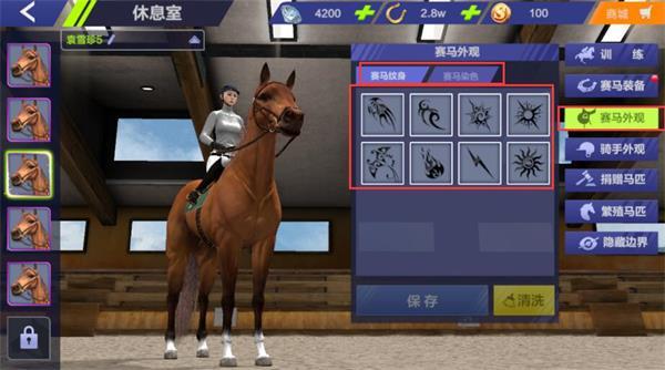 每匹赛马都有它自己的个性和特点,为了让我们打造属于自己赛马的个性和特点,特别开放了赛马的纹身和染色系统; 通过培育中心的赛马外观可打开纹身染色界面; 赛马纹身可以将特定的图案纹在赛马脖子上面,让我们的赛马在赛场与众不同; 纹身的步骤很简单,选定一个图案,可以预览纹身效果,点击保存支付一定费用即可完成纹身操作; 除了纹身还可以对赛马进行毛发染色,染色只针对赛马的鬃毛和尾毛,同样支付一定费用可将赛马的