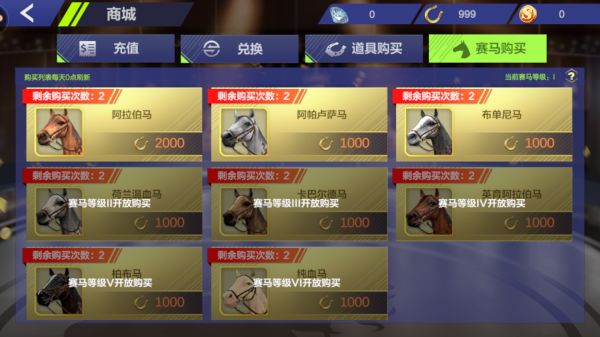 随着我们在挑战赛过关的关卡越来越多,我们对赛马的需求也自然越来越高,这样的情况下我们要怎样才能获得更高级的马匹呢,今天我们就来介绍一下赛马的等级; 每一匹赛马都有等级,初始等级为I,赛马总共有I、II、III、IV、V、VI,六个等级,随着等级越来越高,赛马的基础属性也会越来越高; 高等级的赛马需要我们拥有称号之后去商城或者相马活动里面购买获得; 在个人资料里面我们可以看到有六个等级的称号,这六个
