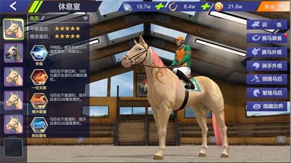 游戏内赛马属性包含:速度、耐力、爆发、平衡四条属性; 各属性的影响效果为: 速度:影响赛马的直线速度和初始速度 爆发:影响赛马爆发消耗耐力和爆发系数 耐力:影响赛马耐力最大值和耐力恢复速度 平衡:影响赛马弯道速度和弯道的加速度 那赛马的以上属性,该如何提升呢!请查看往下看: 途径1:马匹训练 途径2:马匹繁殖 接下来就是重点,了解全面将有助你,选择合适的赛马,更好的取得比赛胜利! 爆发能力强的赛马