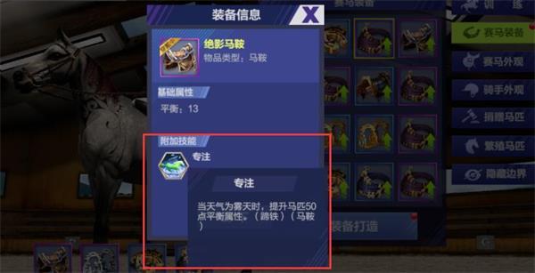 你是否发现马匹评分超高,却怎么也跑不赢对方! 是否老是在吸别人马匹的马屁呢! 如果您是这样的情况,那就看看其他玩家是怎么玩的吧! 经过与部分忠实玩家交流得知,合成装备时是有几率获得装备技能的,且技能的效果比直接增加属性的效果要好得多,这些技能便是他们称霸赛场的终极利器! 同时装备还会出现对应场地、天气的专属技能,在参与比赛是可以根据场地情况,选最优装备进行穿戴,以便获得最佳的比赛效果! 其次相同类