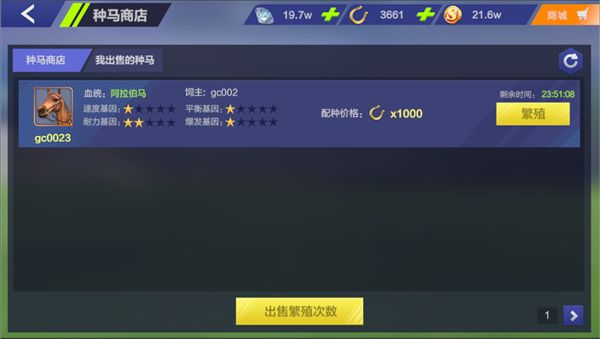 当我们拥有高星级赛马的时候,我们可以通过种马商店将种马繁殖次数出售从而获得收益; 上架的时候需要赛马拥有剩余繁殖次数大于1,点击出售繁殖次数按钮即可打开出售界面; 出售界面可以查看出售赛马的信息以及设定出售货币种类和数量,点击确认出售即可上架; 上架后等待其他玩家来繁殖就可以收取费用啦! 上架期间不影响赛马比赛的哦,上架24小时候没有出售成功会自动下架,期间有玩家购买后也会下架,每次上架只能出售一