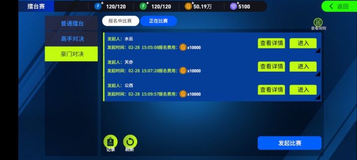 擂台赛是游戏中很特别的一个赛事,它的魅力来自于它的不确定性以及高风险高收入!可以一对一的battle,也可以群雄逐鹿问鼎冠军!首先看到的是擂台赛列表,按照报名费用分为3个等级,如果你需要先体验一下可以选择普通擂台轻松尝试,熟悉后可选择稍微有些竞争力的高手对决,等金币实力、马匹战力雄厚则可以挑战豪门对决!再来看看如何发起擂台赛,只要你有100金币就可以发起擂台。发起擂台时设置参加擂台的条件,包括