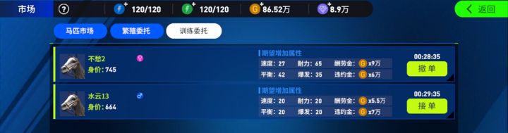 上次讲到了马匹市场拍卖马匹,售卖马匹虽然赚钱多又快,但也不是破铜烂铁都能卖出去,想要靠卖马赚钱,那起码得家大业大,拥有属性优势明显的马匹。所以今天给大家介绍下另外2种赚钱的方式,虽然时间消耗稍长一点,但只要够勤快还是有钱赚的! 市场的另外两个模块就是繁殖委托和训练委托,包括发布委托、接单。发布委托:当自己时间不足或者学习天赋不足时,可发布订单,委托其他人训练或者繁殖小马,接单前可撤单;发布流程: