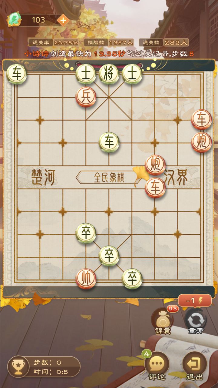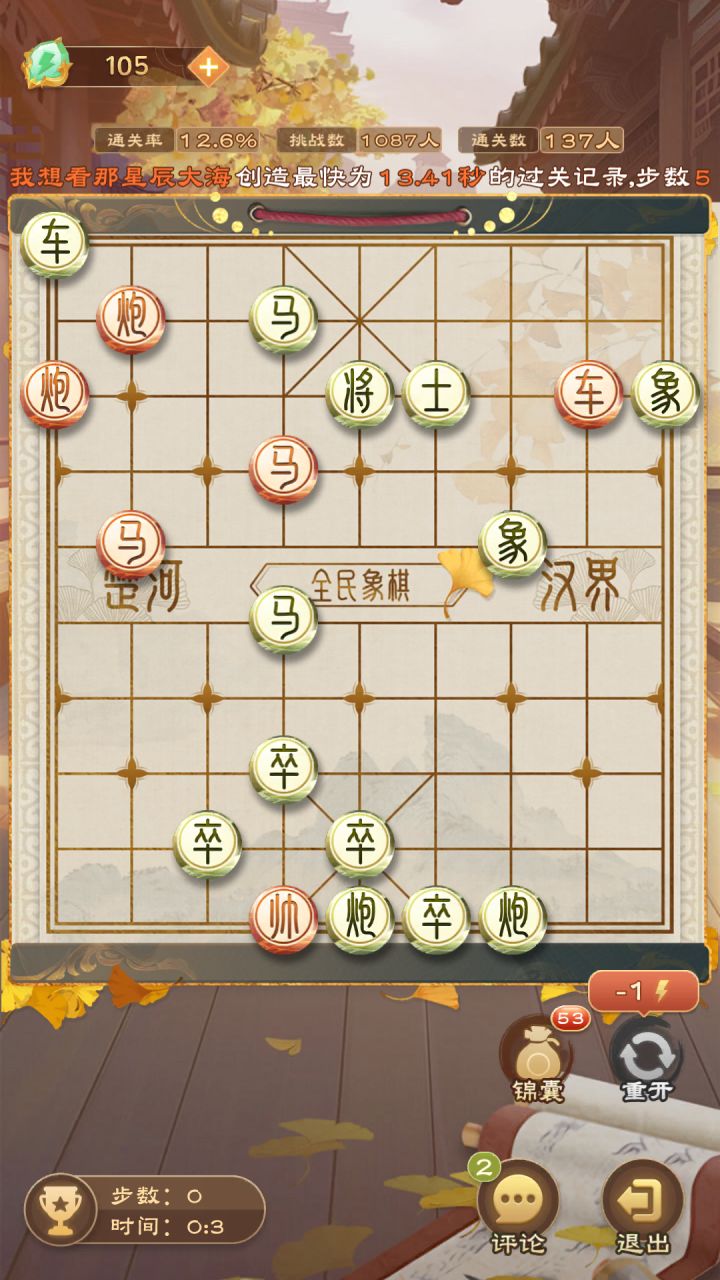 各位棋手晚上好呀!下面为大家奉上今日的每日残局攻略~1、炮三平五 2、车一平五 3、炮一进三 4、车三进五 5、兵六平五 6、车三退二如果各位棋手有更好的解法,欢迎在评论区留言喔~