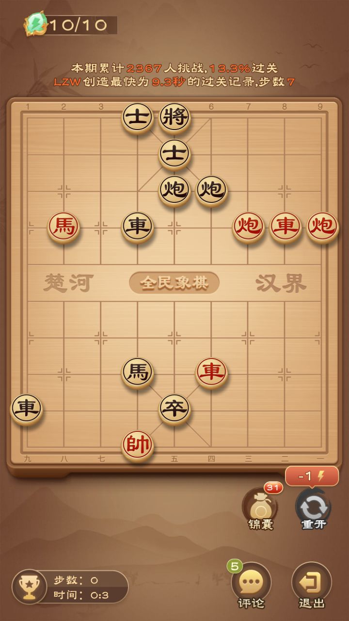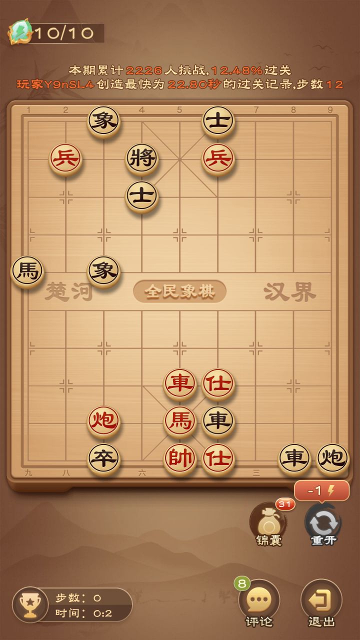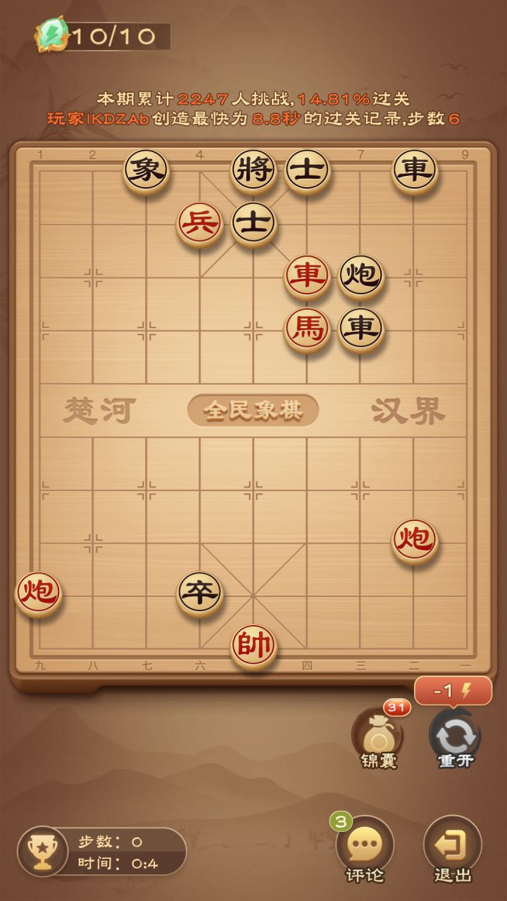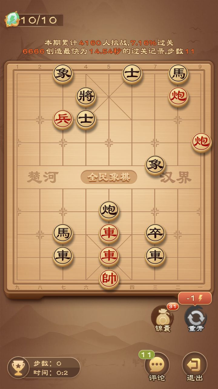 各位棋手晚上好呀!下面为大家奉上今日的每日残局攻略~1. 炮九进八 2. 兵六进一 3. 车四平六 4. 炮二平六 5. 马四进六 6. 马六进七如果各位棋手有更好的解法,欢迎在评论区留言喔~#攻略#游戏攻略#新手攻略