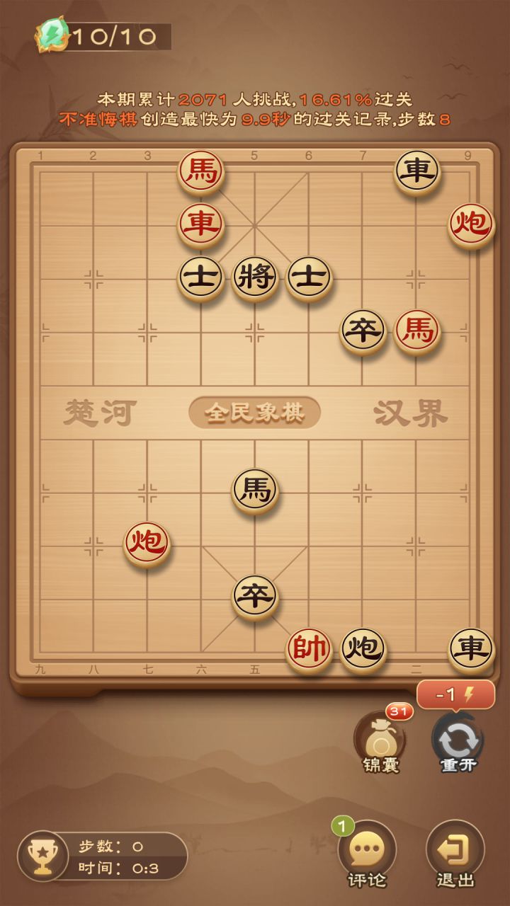 各位棋手晚上好呀!下面为大家奉上今日的每日残局攻略~1. 炮七进五 2. 车六退一 3. 马六退八 4. 马八退七 5. 马七退五 6. 马五进三 7. 马三退五 8. 马二进三如果各位棋手有更好的解法,欢迎在评论区留言喔~#攻略#游戏攻略#新手攻略