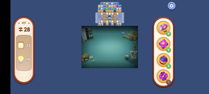 游戏前一个小时,在首个房间(客厅)和第二房间(卧室)时的体验是很不错的。目前市面上三消类型的游戏很多,本作采用的是传统三消的轻度进阶,除了在限定的步数内,通过三消行为获得道具,还可以通过四消、五消合成道具。不支持对角消,但是接受“区域消除”。(正方形、T字型)