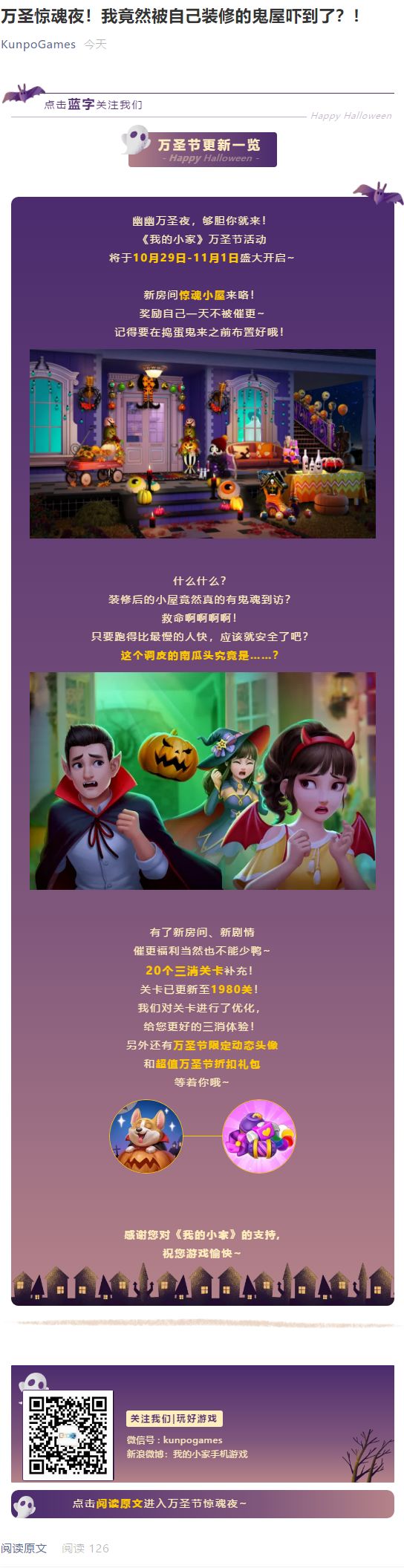 幽幽万圣夜,够胆你就来!*万圣节活动将于10月29日-11月1日盛大开启!*活动房间:惊魂小屋。玩得就是心跳!*活动剧情:救命啊啊啊啊!只要跑得比最慢的人快,应该就安全了吧?*全新动态头像:惊魂小屋装修竣工即可获取一枚会动的柯基头像!*特惠道具礼包:超值折扣礼包限时开启,欲购从速!更佳游戏体验*催更党福利:20个三消关卡补充!关卡已更新至1980关!*我们对关卡进行了优化,给您更好的三消体验!感谢您对《我的小家》的支持,祝您游戏愉快!