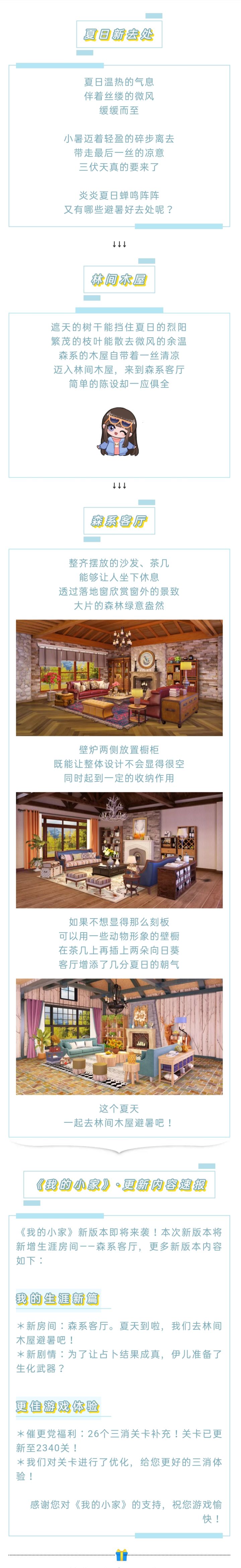 随着新版本的到来咱们的周年庆盛典也即将开启啦!周年庆到底会带给小伙伴们怎样的惊喜呢?赶快跟着小白一起来看看吧!?ヽ(✿゚▽゚)ノ↓↓↓一周年更新内容速报盛典《我的小家》一岁啦!周年版本重磅上线!新活动开启*蝉鸣中的回忆:惊喜房间登场!错过不知要再等多久!*云端邂逅:保持连胜,纸飞机助力过关,再也不用担心卡关啦!*超值大赠送:充值赠好礼,福利拿不停,更有彩蛋剧情等你解锁哦!*