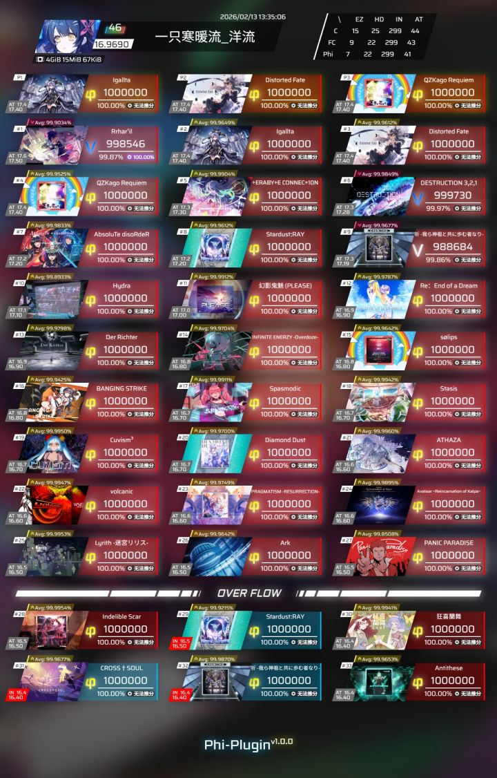 而对于rks在12~14之间的玩家来说,可以主要关注HD上位(HD13)和简单IN15及以下,All Perfect曲目的定数也要尽可能高。这个阶段不需要盯着较难16看。
