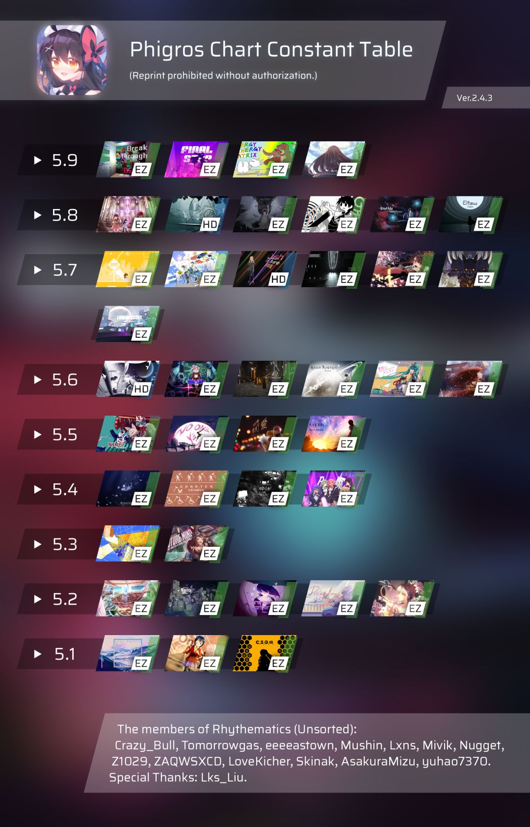 这边也发一下 —————— 定数表部分 —————— 新曲省流是5.1/10.3/14.7 —————— rks计算器部分 —————— 这个是使用例,下载之后输入每首歌的acc即可获取 —————— 定数表原图+rks计算器获取 —————— 加入频道选择Phigros身份组即可
