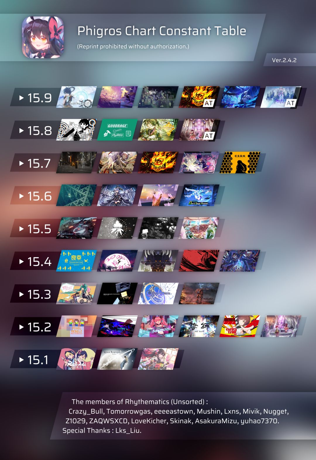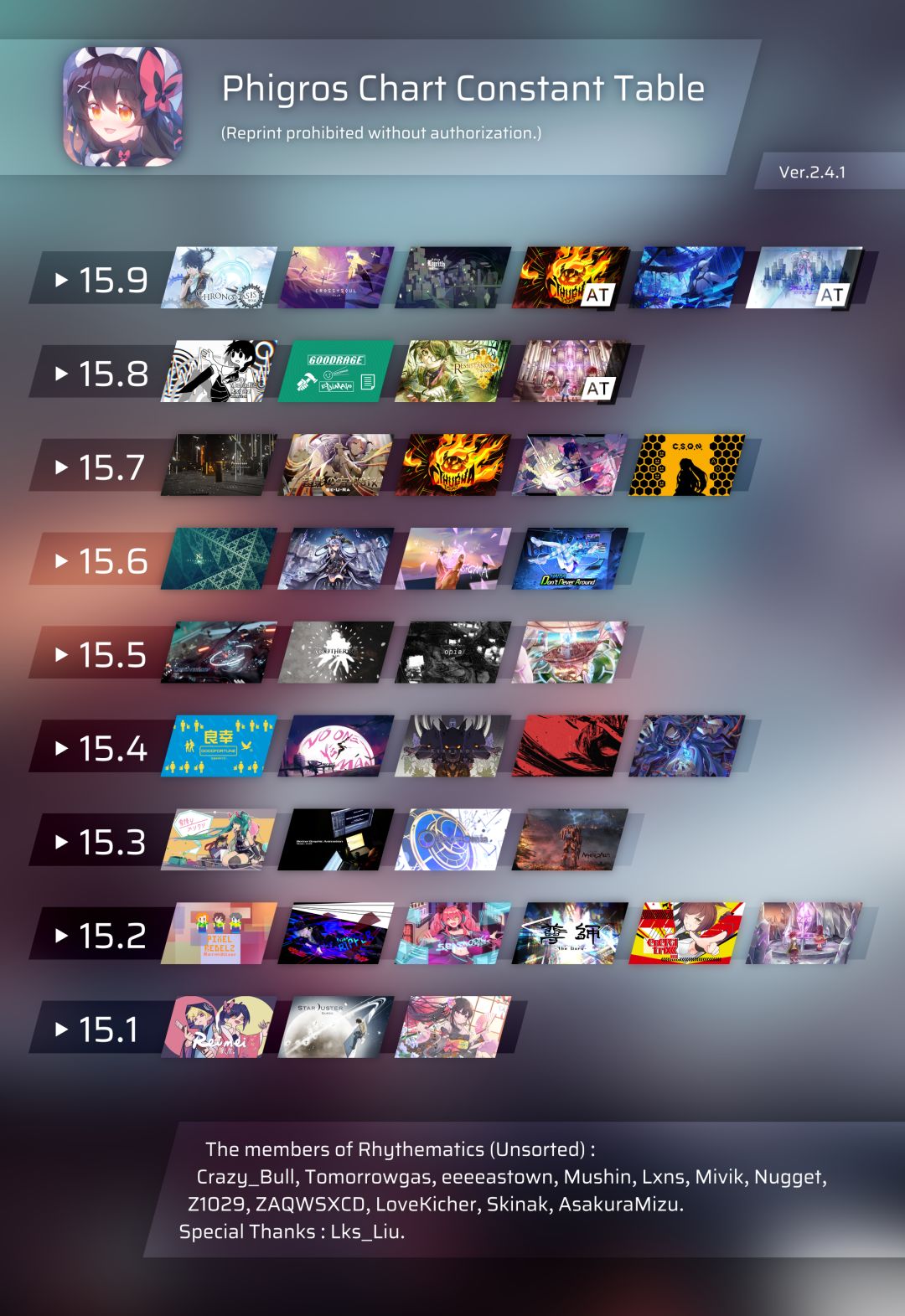 写在前面 1. 定数表的使用许可范围 可以并支持群内转发,或者转发这个专栏 不可以把定数表转载到其他平台,或者做成视频发布 点击原图保存高清定数表 以及...抱图可以点个赞吗 XD 2. 定数是游戏内Rating的计算依据,并不是定数组主观排序! 定数是游戏内Rating的计算依据,并不是定数组主观排序! 定数是游戏内Rating的计算依据,并不是定数组主观排序! 3. Rhythematics组