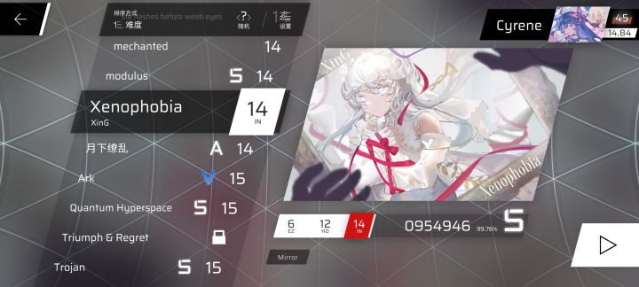 我去我去,我发现我好牛逼。所有博主都在劝说不让越级打我在我rks只有8点多的时候,我就敢打 15,16级的歌后果也是非常显著。玩两年了,虽然说中途经常会出现半年都不玩的情况但我的手癖非常严重,而且到现在为止我那个账号找不回来,我换了6个账号,我的rks只有12.14然后我又不是个很有耐心的人,经常换账号之后又不想打,所以说就放着三四个月不带开一回