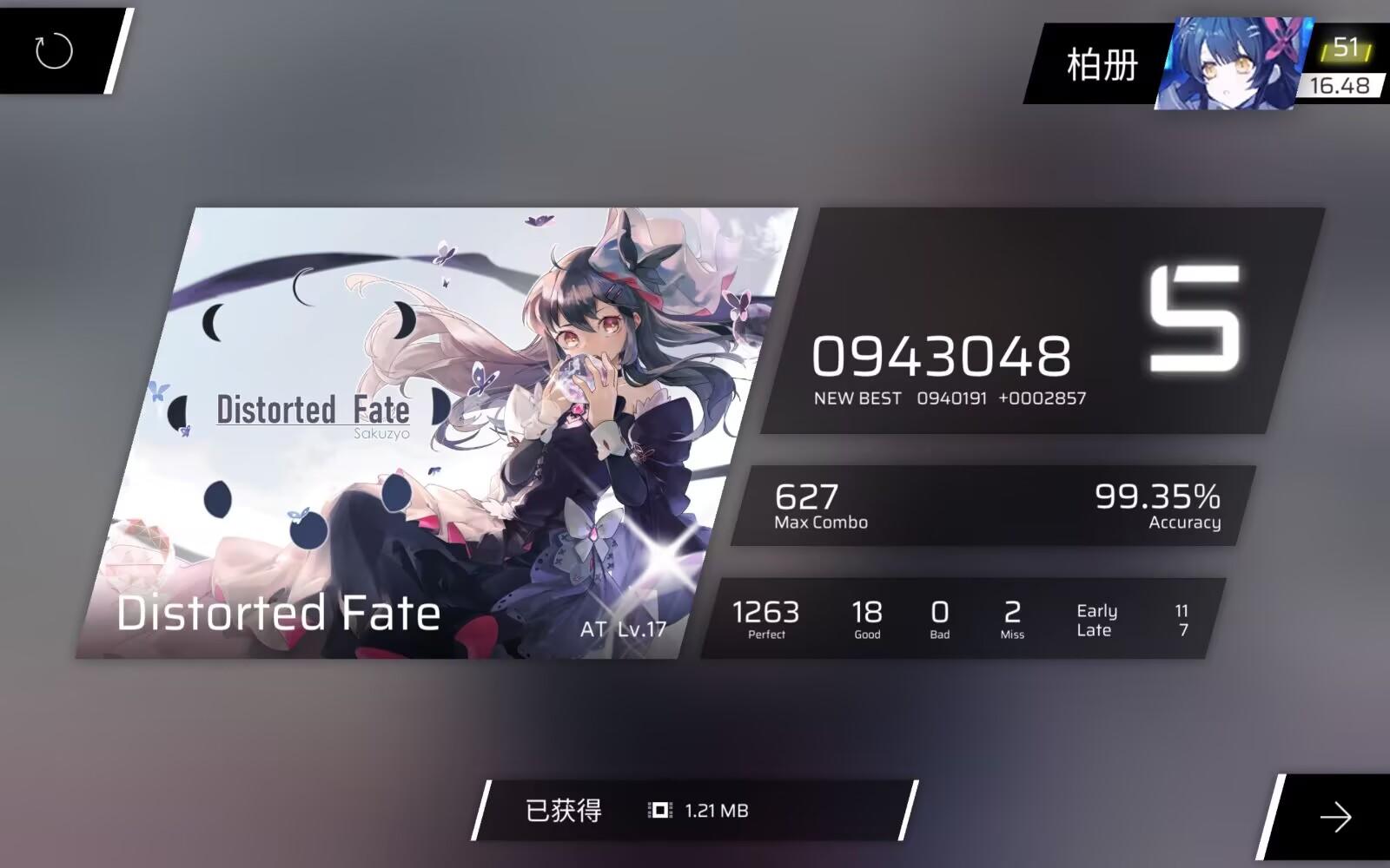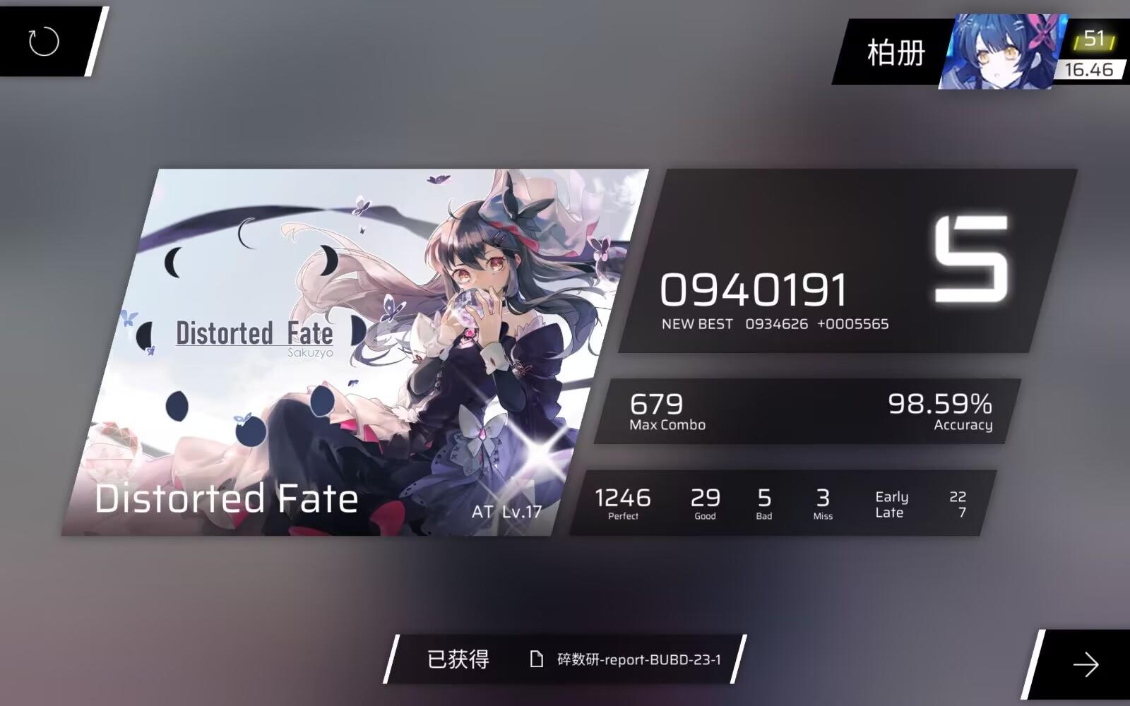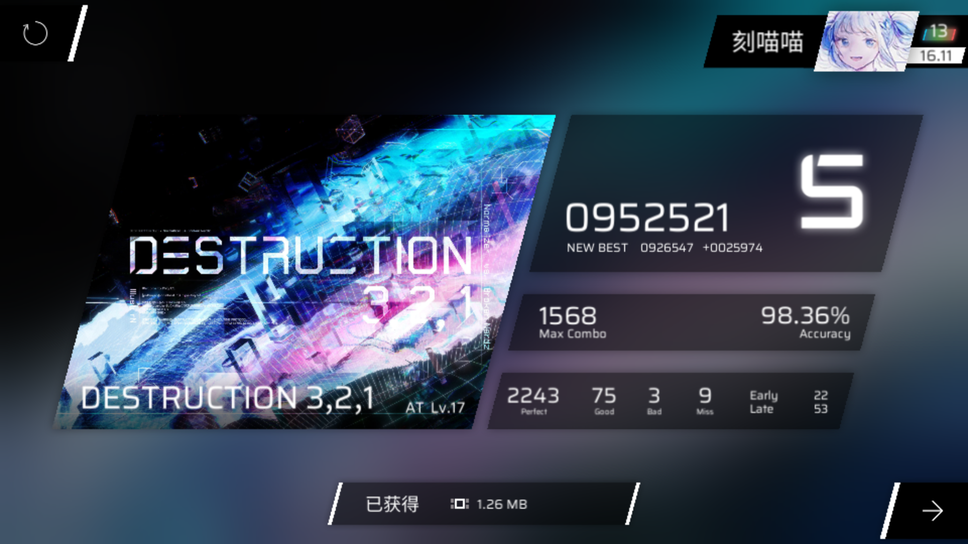 (好久没发帖了,,,其实每天都在推彩,,想伪装成几见收💦)推彩推烦了,看到DF AT 98.04准度想随便玩两下(似曾相识喵喵喵?),结果ACC来到98.55!😱(P2)这个激起了我的推分兴趣,推了三把(顺序:P3、P4、P1)竟然一次比一次高😱😱😱薅到了0.02rks!并且打破字节直接冲上b1😝😝现在除啊啊挨踢以外所有17级ACC 99+ !!!算一个小小的里程碑🎉🎉🎉(17.4里面DF准