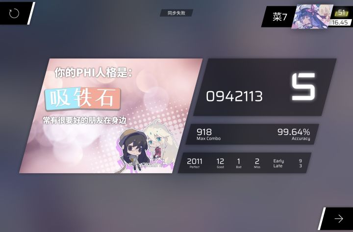 中间那一段假键和云女孩有点手癖了,不推了最高95.5w,99.64acc#phigros