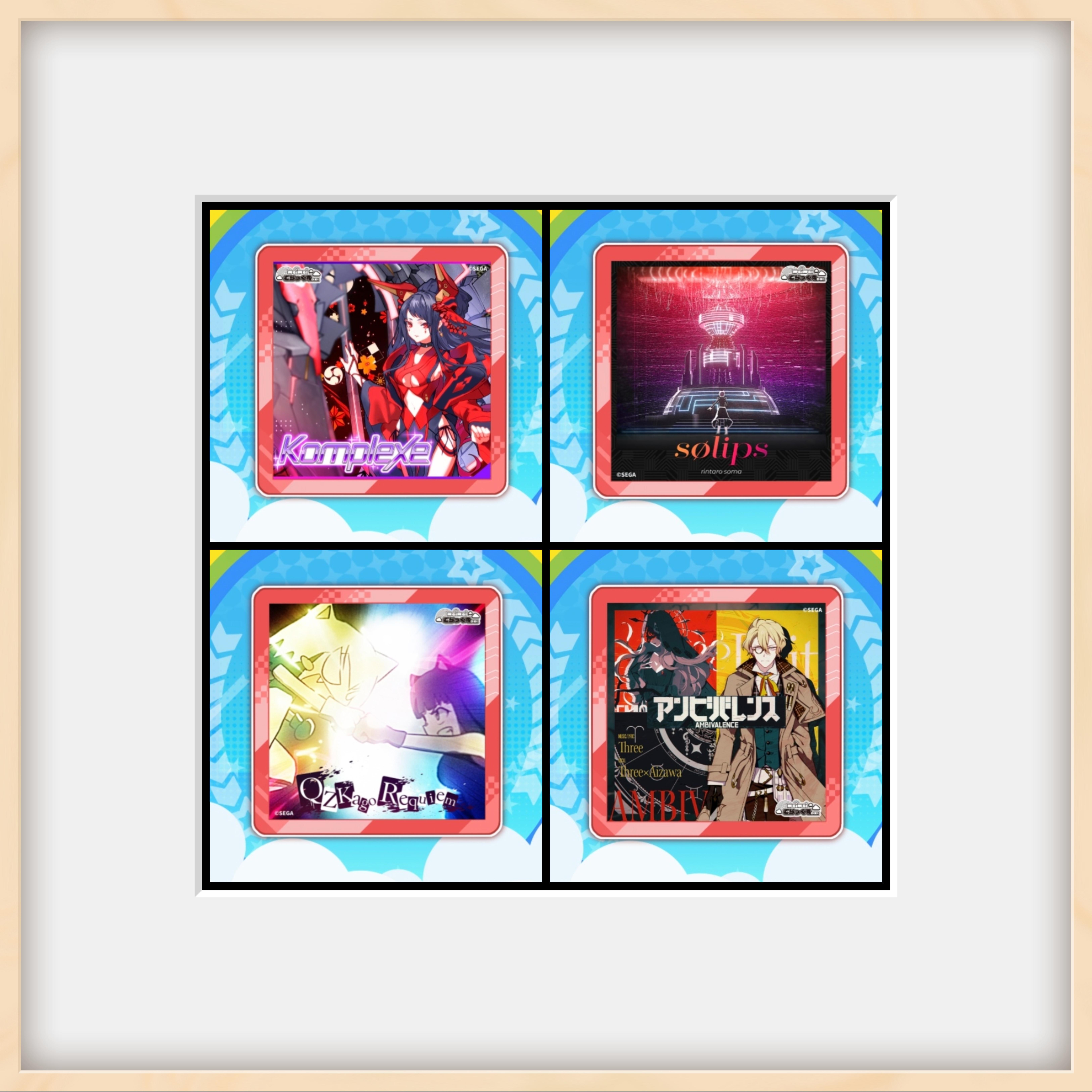 #phigros 谱面名:「アンビバレンス」by:すりいx相沢 难度:HD Lv.8 谱面名:「Komplexe」 by:雄之助feat.Sennzai 难度:HD Lv.9 谱面名:「sølips」 by: rintaro soma 难度:HD Lv.12 谱面名:「QZKago Requiem」 by: t+pazolite 难度:HD Lv.13