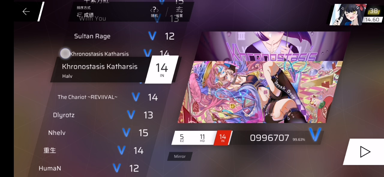 一位phi玩家在只p了两首14的情况下rks达到了15.10,这是他的分表