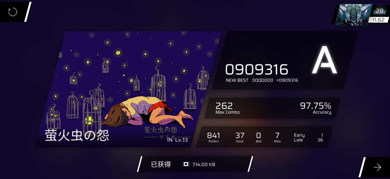 得分情况 Score 0916232 Grade A Max Combo 141 Accuracy 98.02% Perfect 398 Good 12 Bad 0 Miss 4 Early 0 Late 12